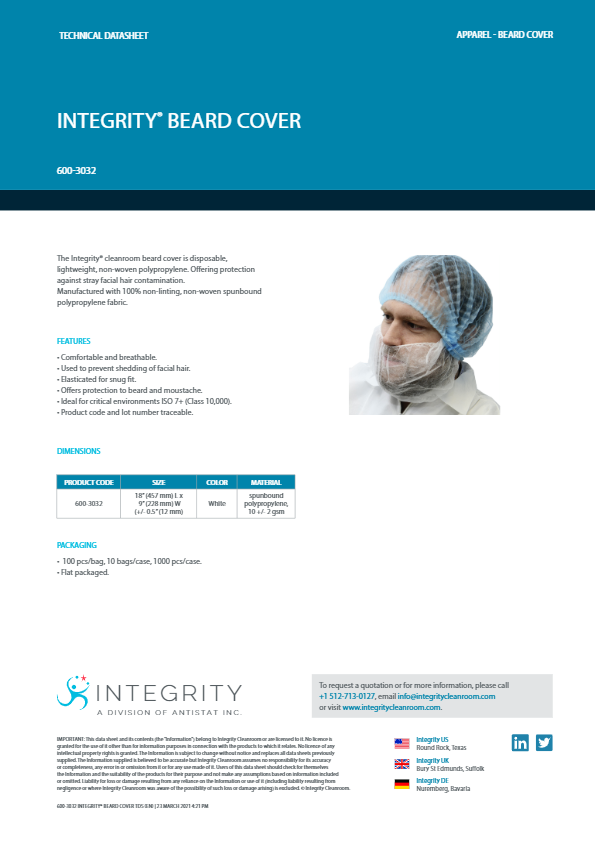 The Integrity beard cover is disposable, lightweight, non-woven polypropylene offering protection against stray facial hair contamination.